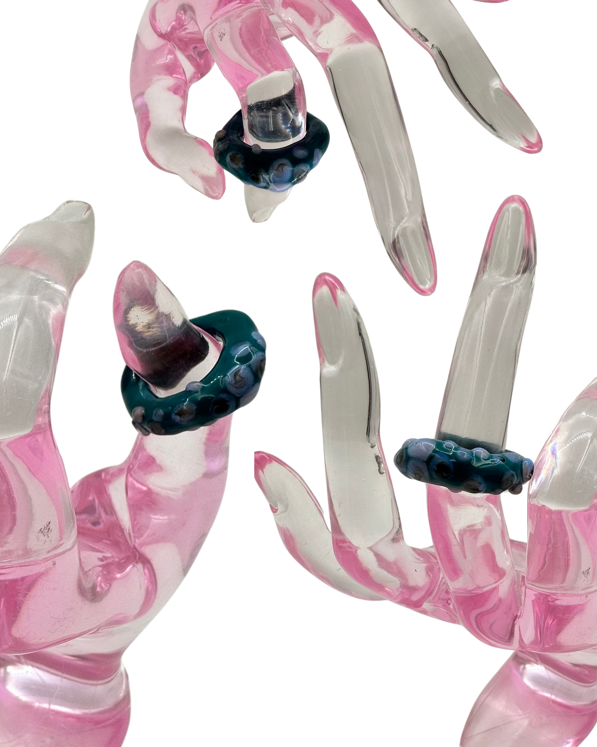 Anillo de cristal artesanal en azul verdoso intenso, con una textura que recuerda las olas del océano. Cada pieza es única, como un pequeño tesoro del mar.