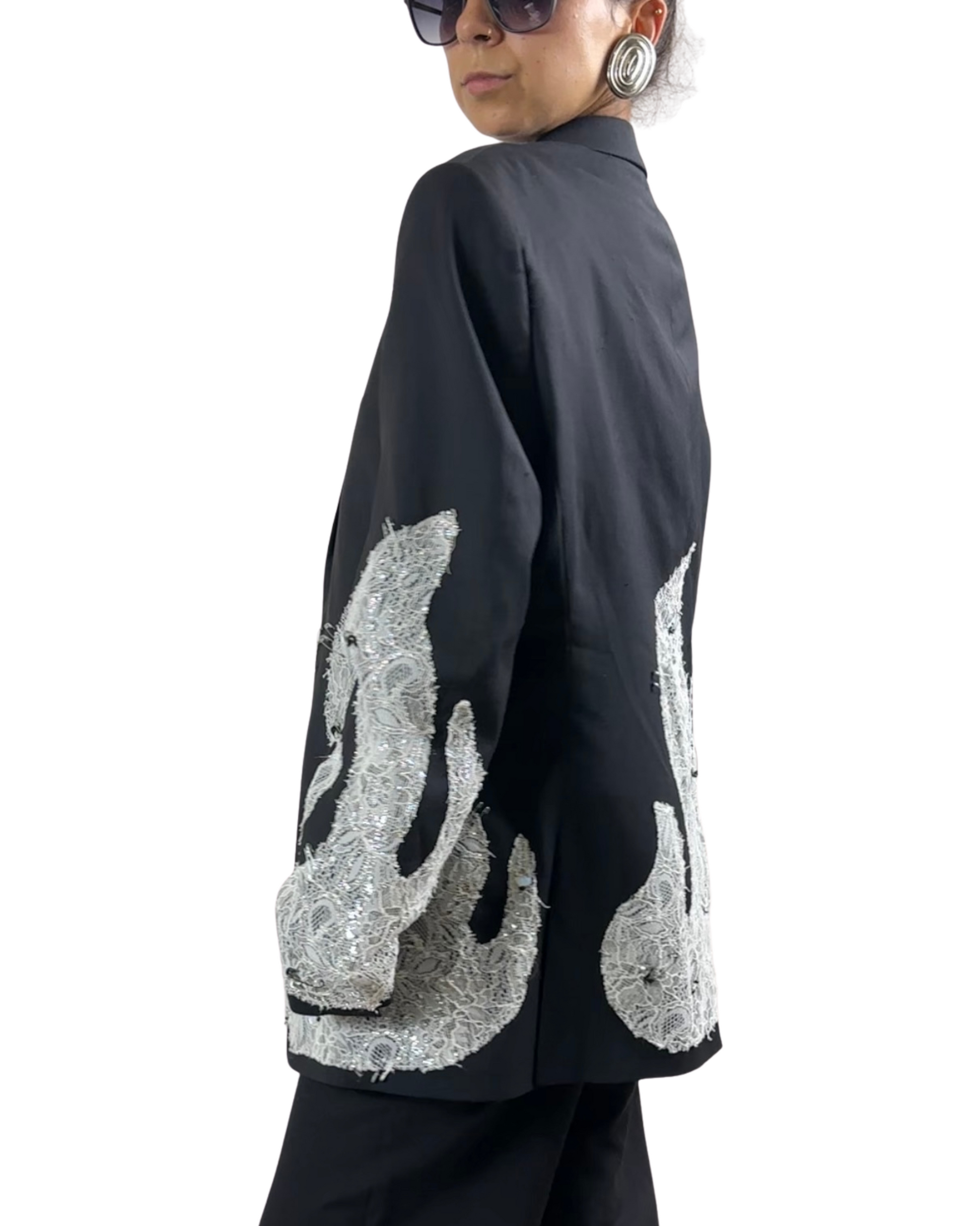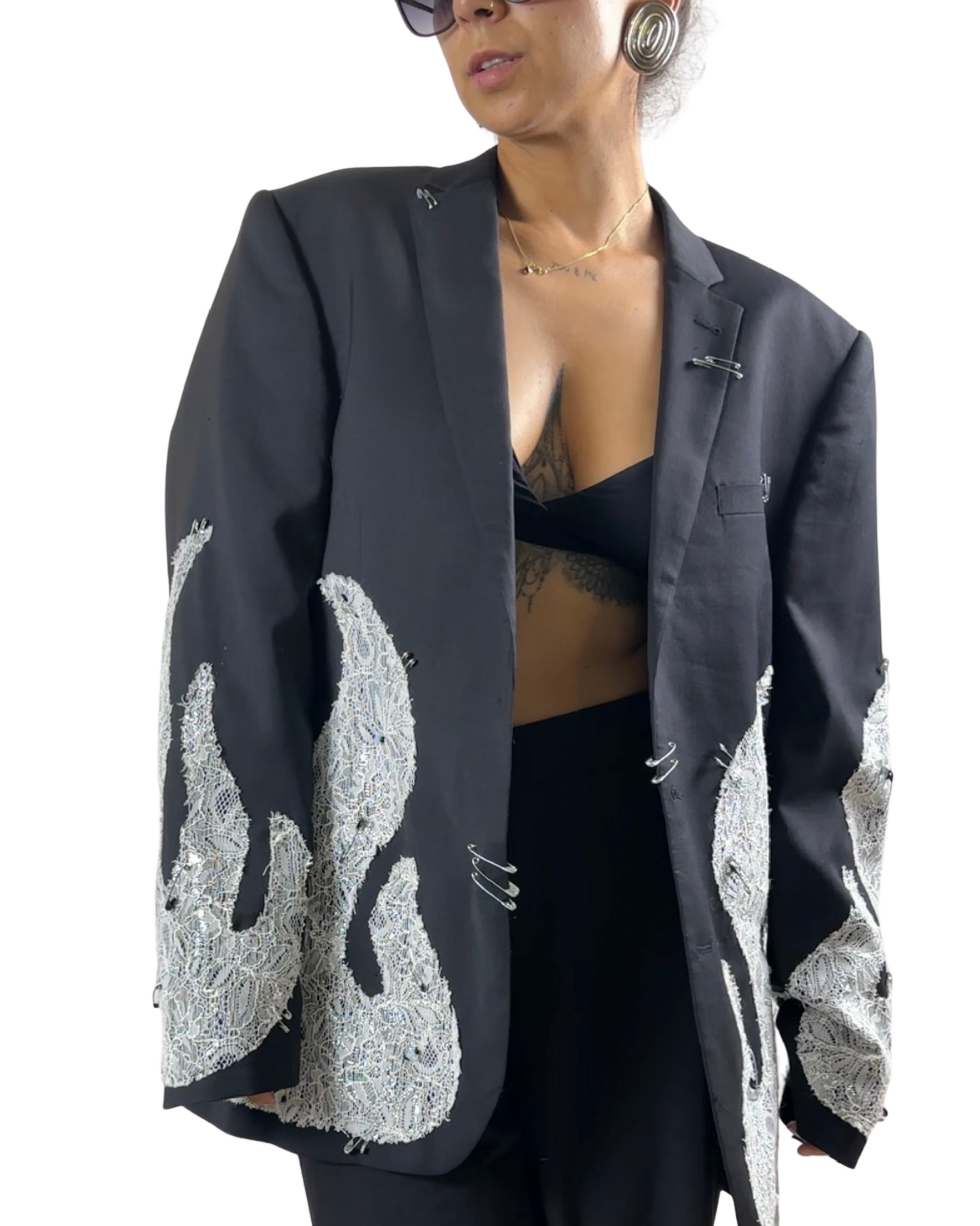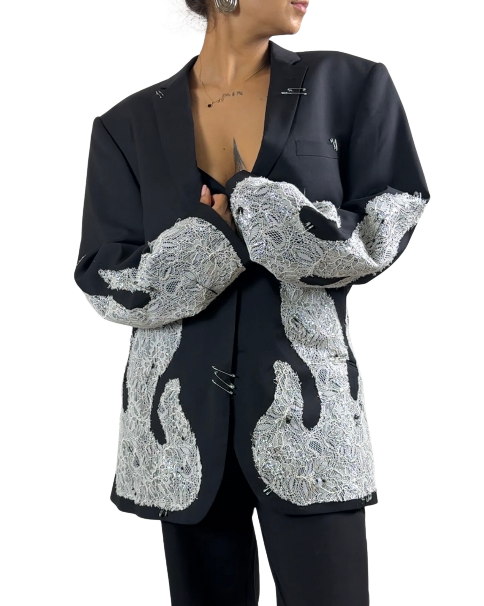 Blazer Custom Flame en color negro oversize, diseñado con un toque audaz y elegante gracias a sus llamas de encaje blanco que crean un contraste sofisticado y moderno. Su corte estructurado realza la silueta mientras aporta un aire contemporáneo y chic, perfecto para looks formales con personalidad o para transformar un outfit casual en uno impactante. Una pieza versátil que combina fuerza y elegancia, ideal para quienes buscan destacar con estilo único.
