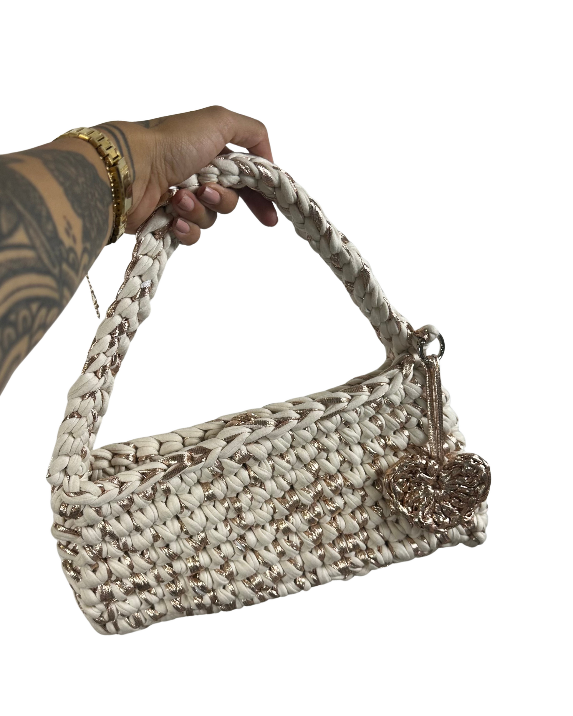 El Bolso Aura en blanco con destellos dorados es sinónimo de elegancia luminosa. Tejido a mano con dedicación, combina la pureza del blanco con el brillo sofisticado del dorado, creando un accesorio que resalta en cualquier ocasión. Su diseño artesanal con asa trenzada y acabado delicado lo convierte en el complemento ideal para quienes buscan un estilo refinado y atemporal.