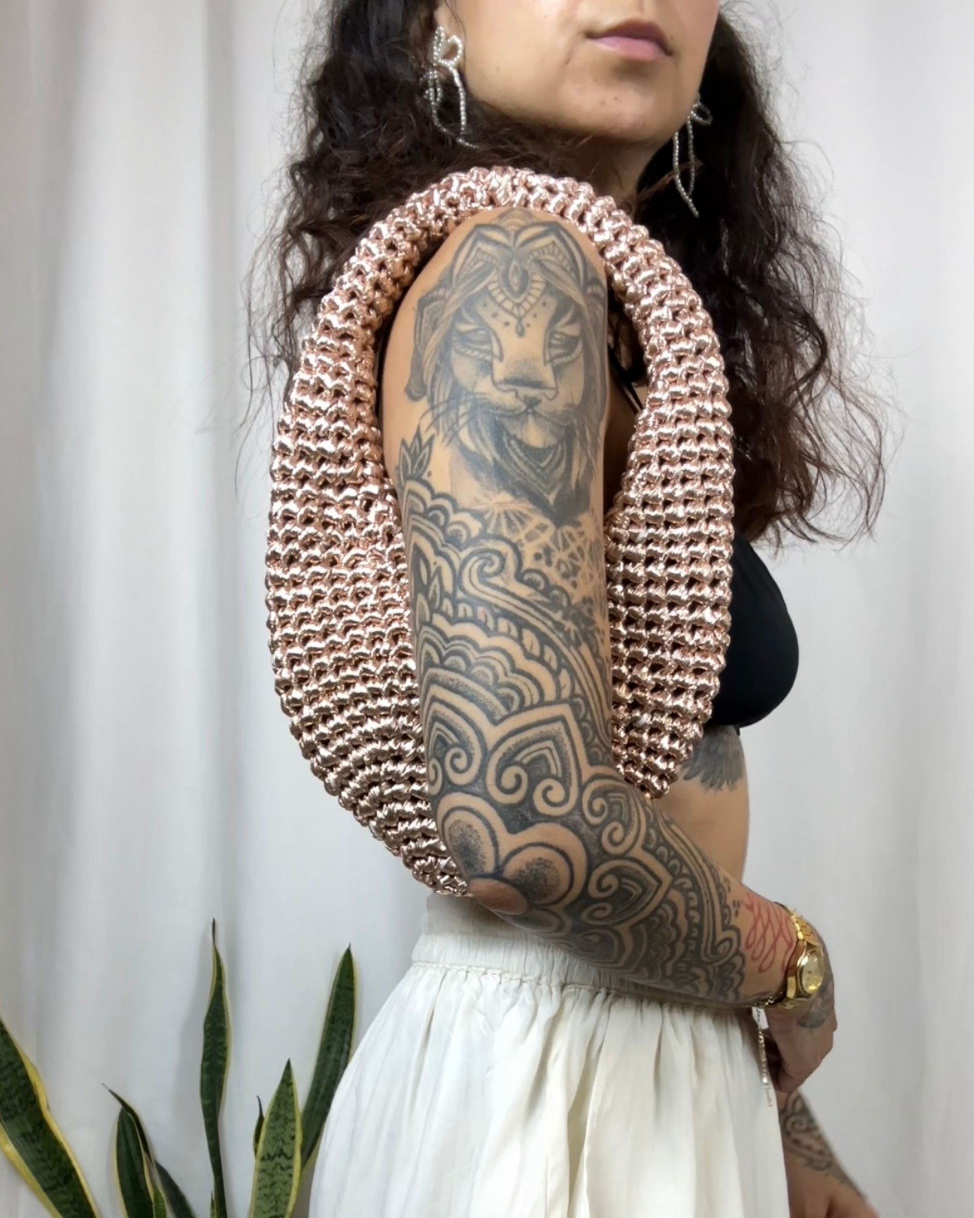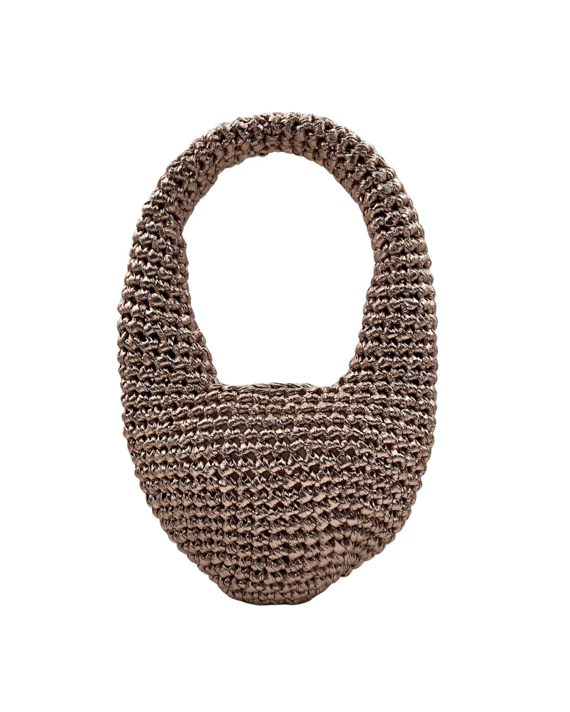Descubre el encanto artesanal con este bolso tejido a mano, elaborado con técnica de crochet en acabado natural. Su diseño boho chic lo convierte en un accesorio versátil y elegante, ideal tanto para el día a día como para ocasiones especiales.